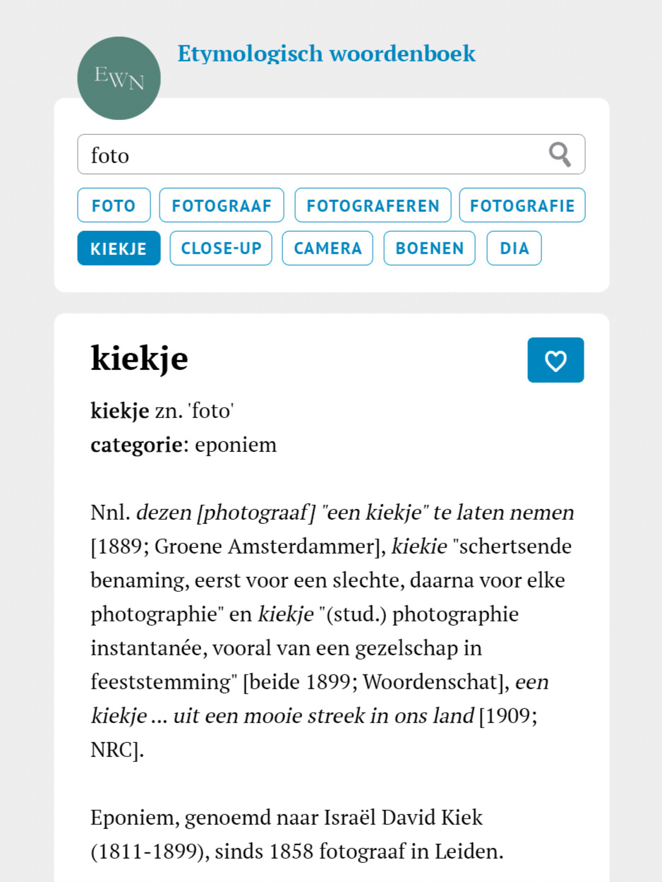 Het Etymologisch Woordenboek van het Nederlands (EWN) is te doorzoeken met de beste zoekfunctie voor woordenboeken. Zo zoek je altijd breed en contextueel.Zoek je bijvoorbeeld op het begrip foto dan krijg je uiteraard het begrip foto. Maar er is meer. Automatisch en razendsnel wordt er namelijk breder gezocht, zodat je altijd de beste resultaten hebt en begrippen contextueel kan plaatsen.Wat krijg je?